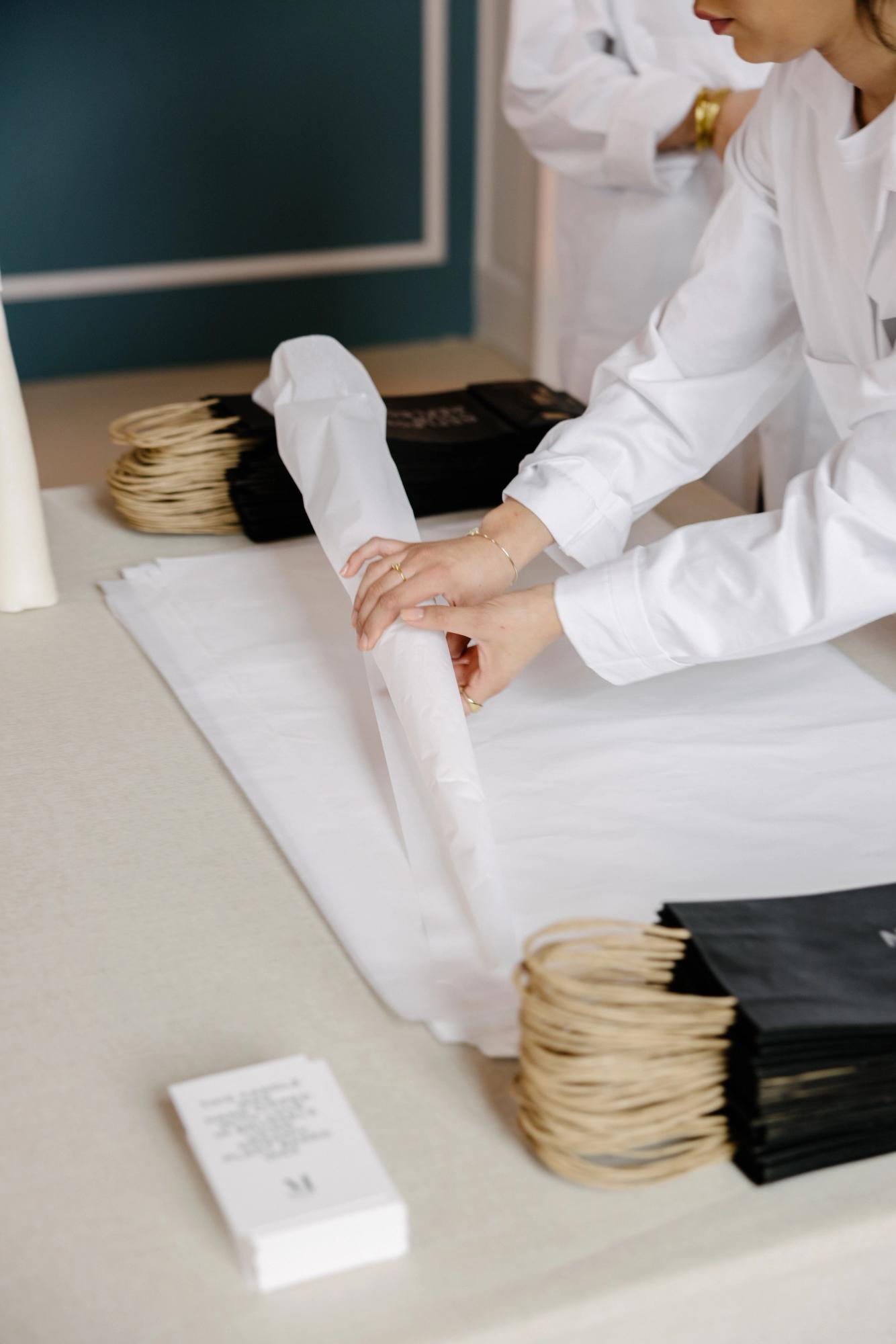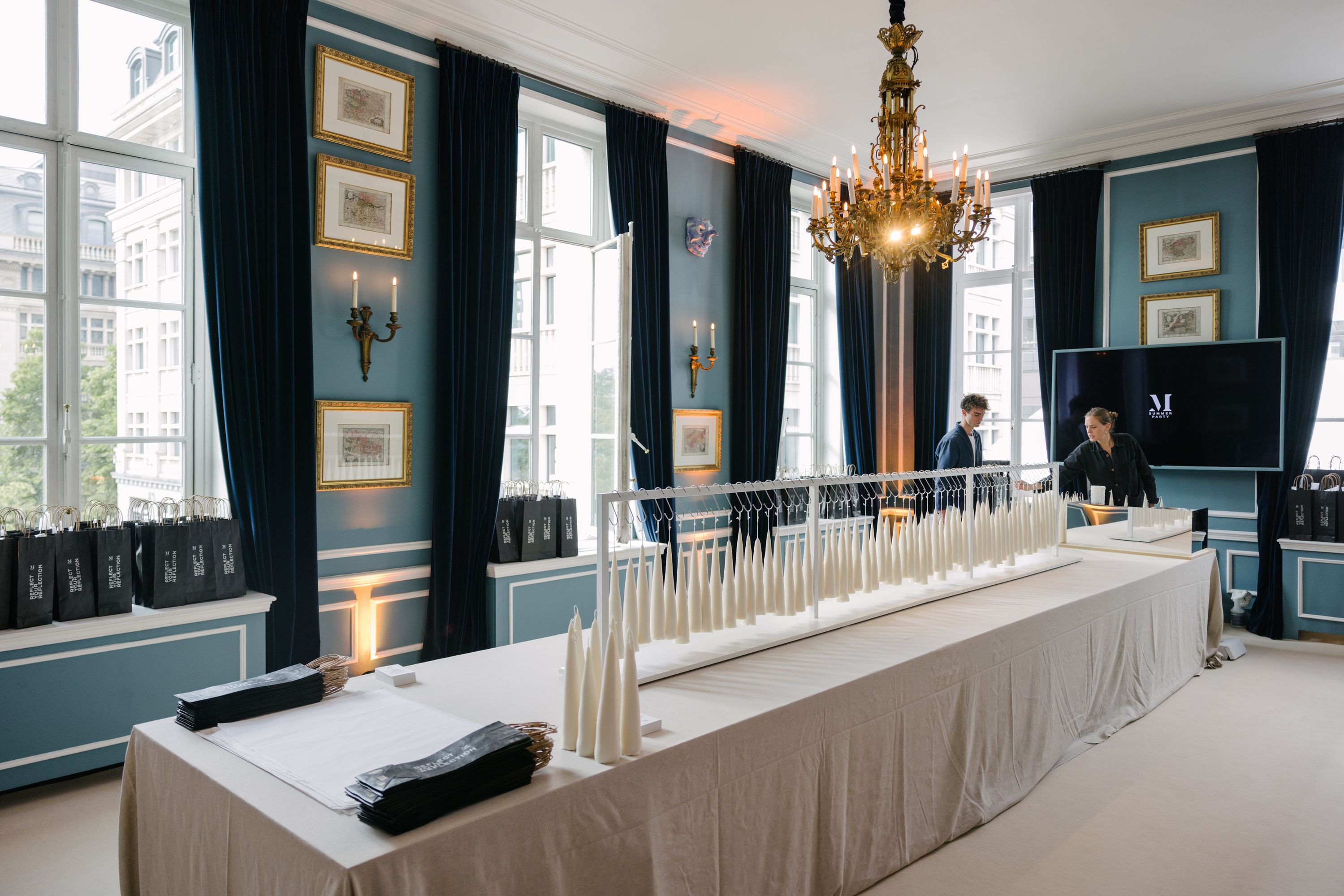 The Salon Bleu was reimagined as a modern ciergerie, where members could enter the candle-making space, explore the artworks, and select a candle of their choice. As part of the experience, their chosen candle was given a final dip in warm wax in front of them — a ceremonial act that added a personal touch before the candle was wrapped and offered as a keepsake.
