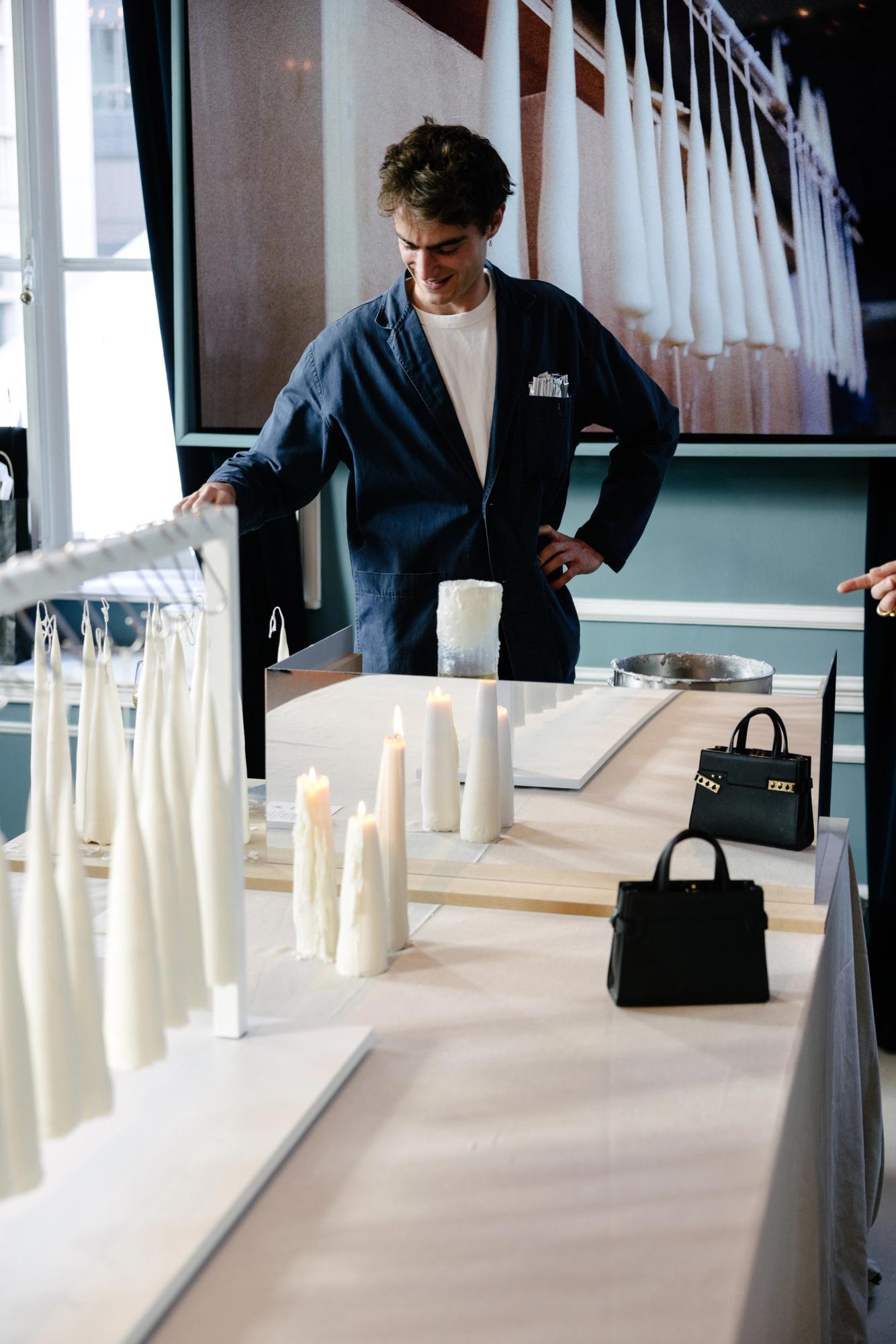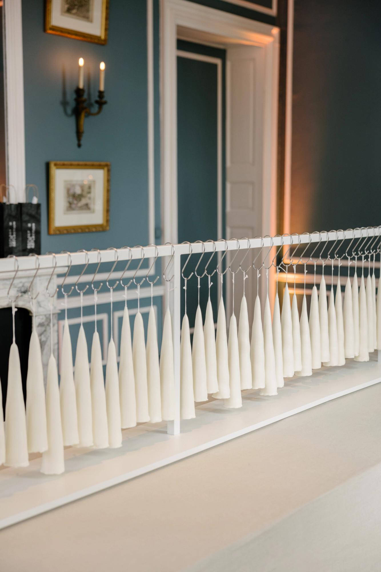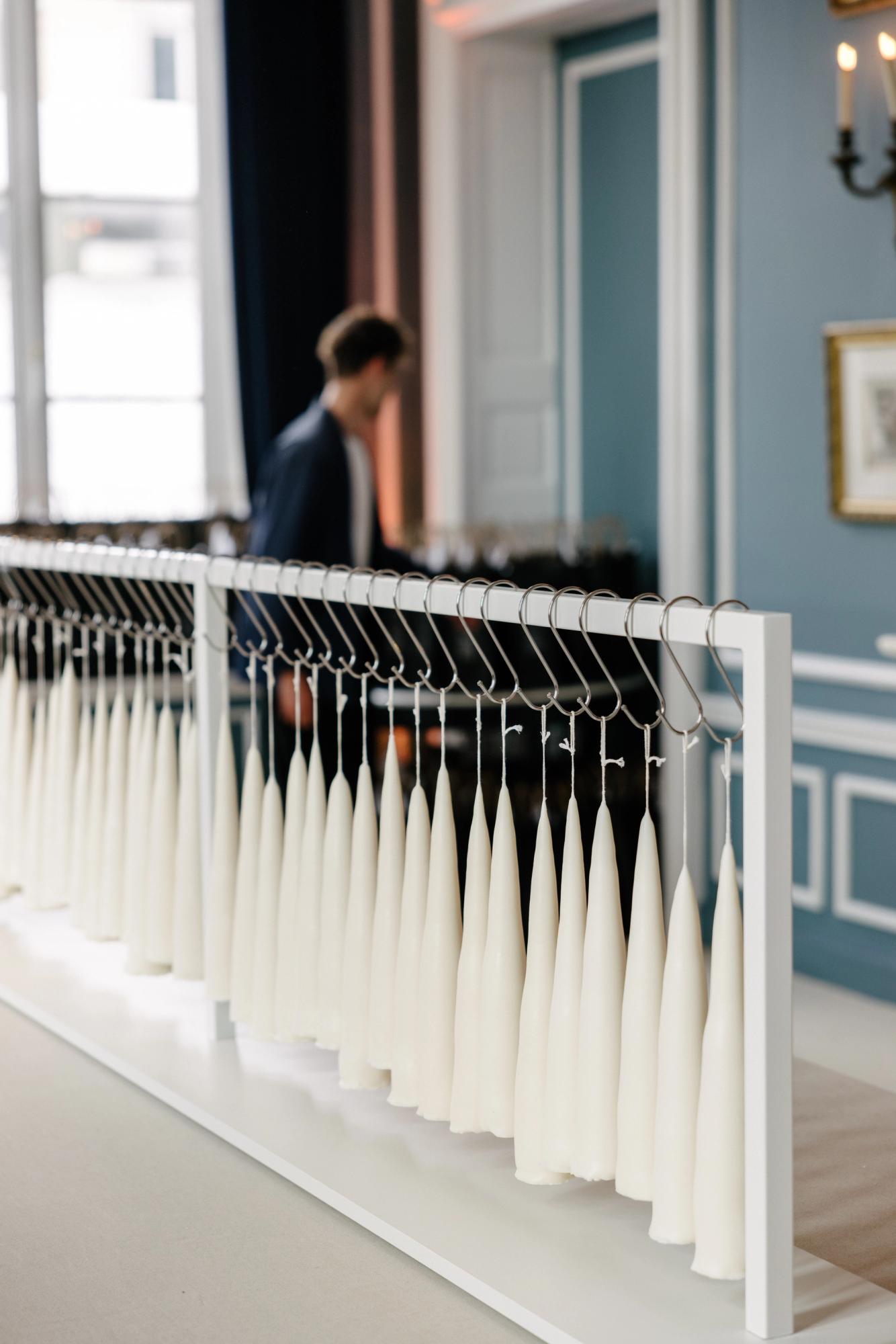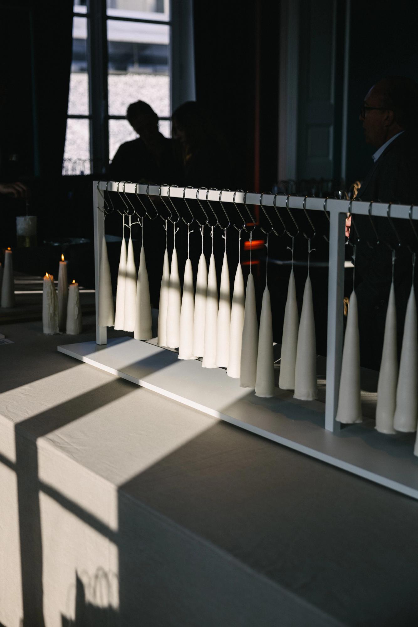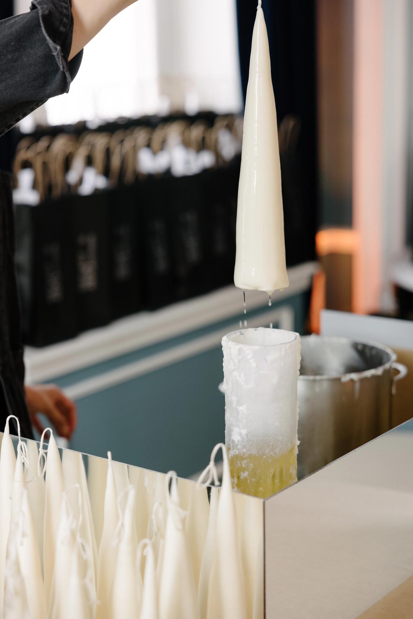 Celebrated for her experimental and poetic approach to candle making, Hélène del Marmol presented a series of sculptural candles crafted entirely from plant-based wax using an ancient hand-dipping technique. Each candle was dipped manually, with no mechanical movement involved, making the process profoundly slow and meditative. A cotton wick was dipped into melted wax up to 70 times to reach a final diameter of approximately 6.5 cm. As a result, each of the 600 candles created for the installation was entirely unique — shaped subtly by the hand that made it and the rhythm of the wax.