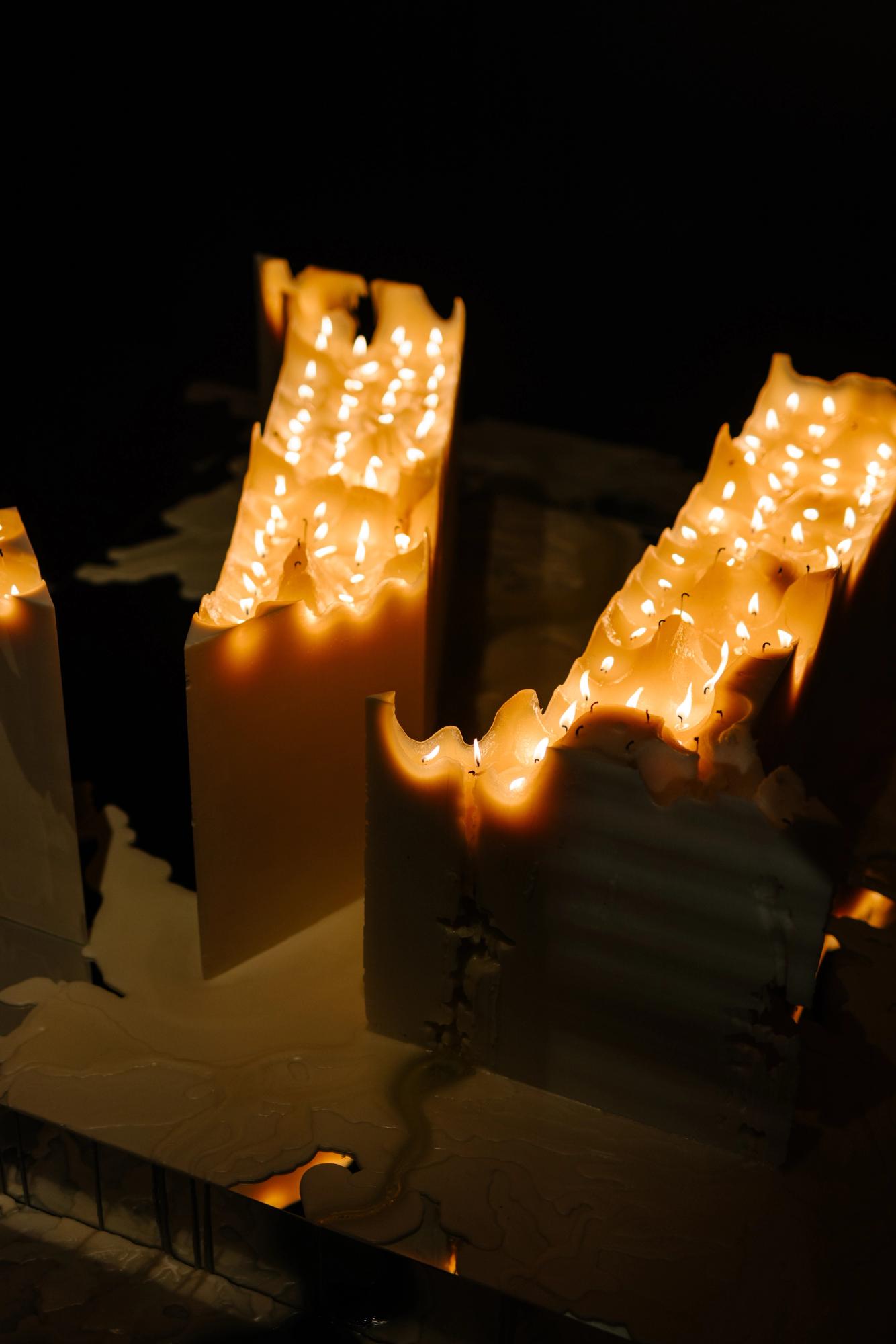 As night fell, all 188 wicks were lit simultaneously, initiating a live, durational burn that continued throughout the evening. The sculpture gradually transformed — its wax melting, warping, and cascading — leaving behind flowing textures and soft trails of wax that spilled over the mirrored plinth and onto the floor. This evolving landscape became both a meditative focal point and a metaphor: light as creation, decay, and renewal.