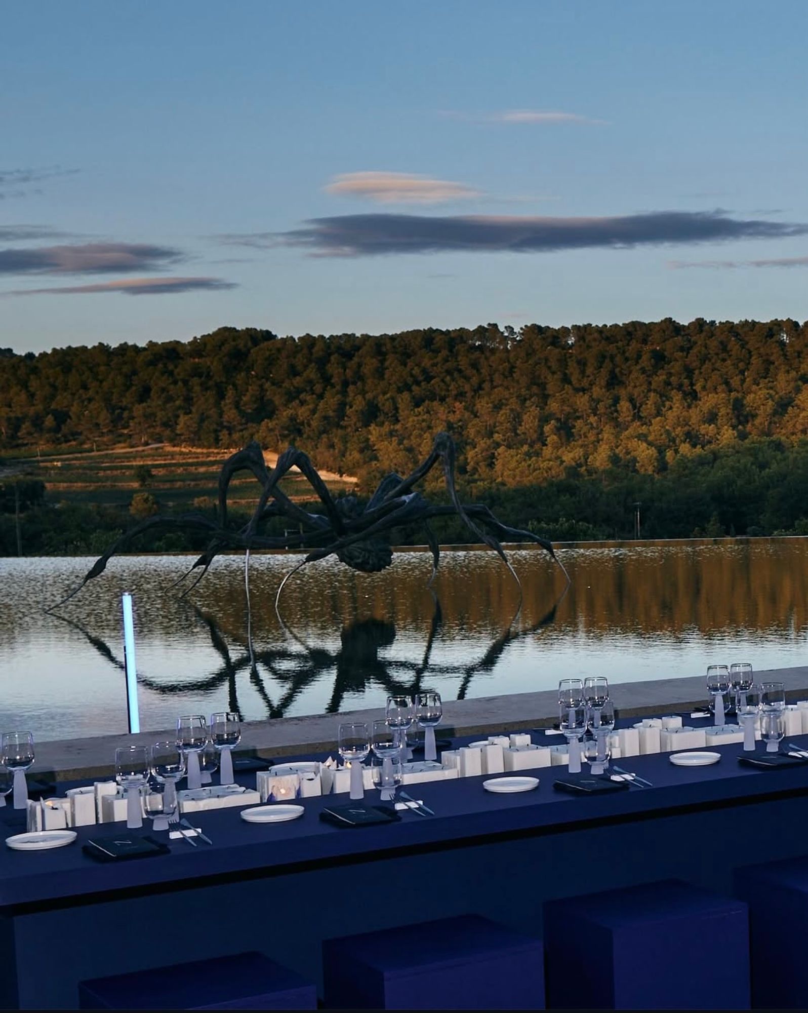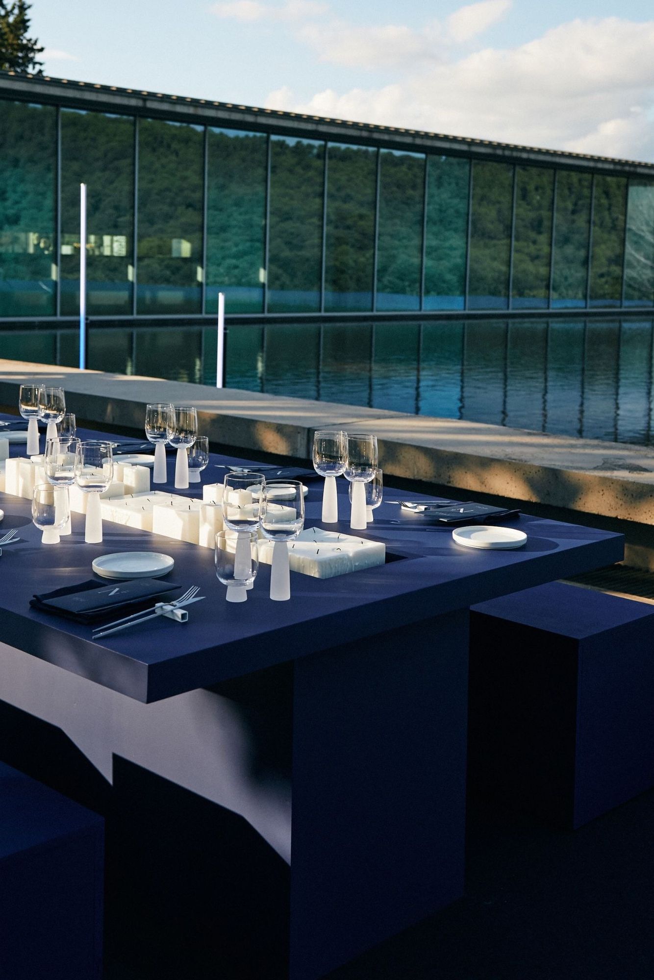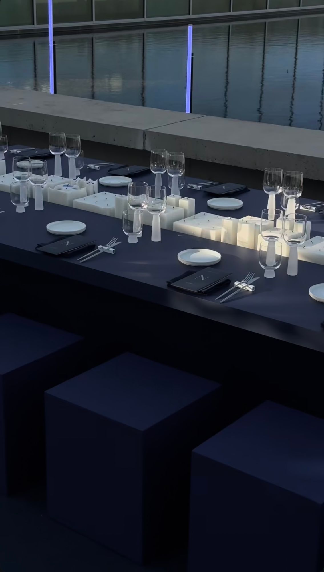 Each candle contained a concealed colored insert, invisible at first glance. As the evening progressed and the candles slowly burned, the inner core was gradually revealed. The melting wax transformed into subtle blue drips — a precise echo of the brand’s signature hue — allowing the installation to evolve over time.
