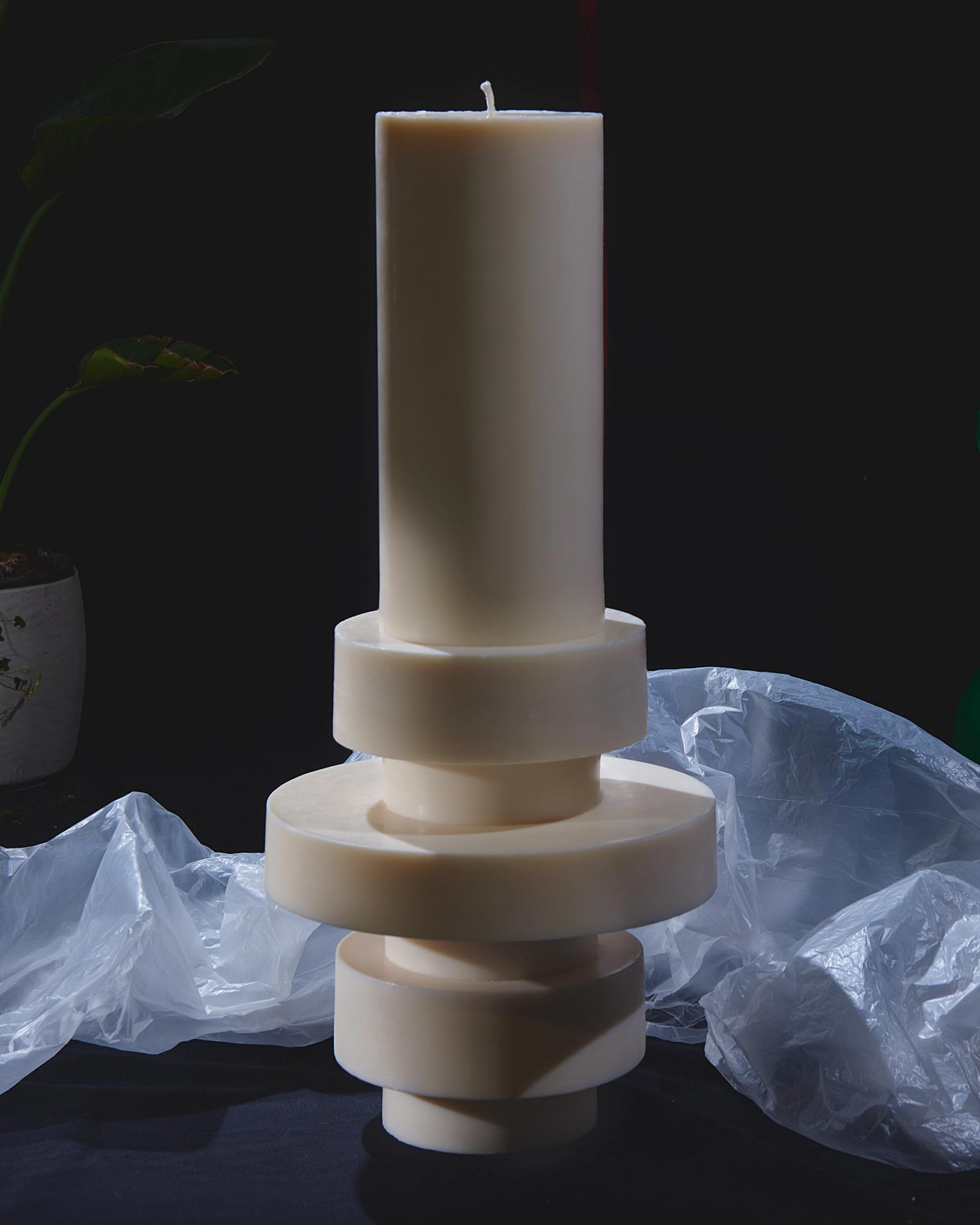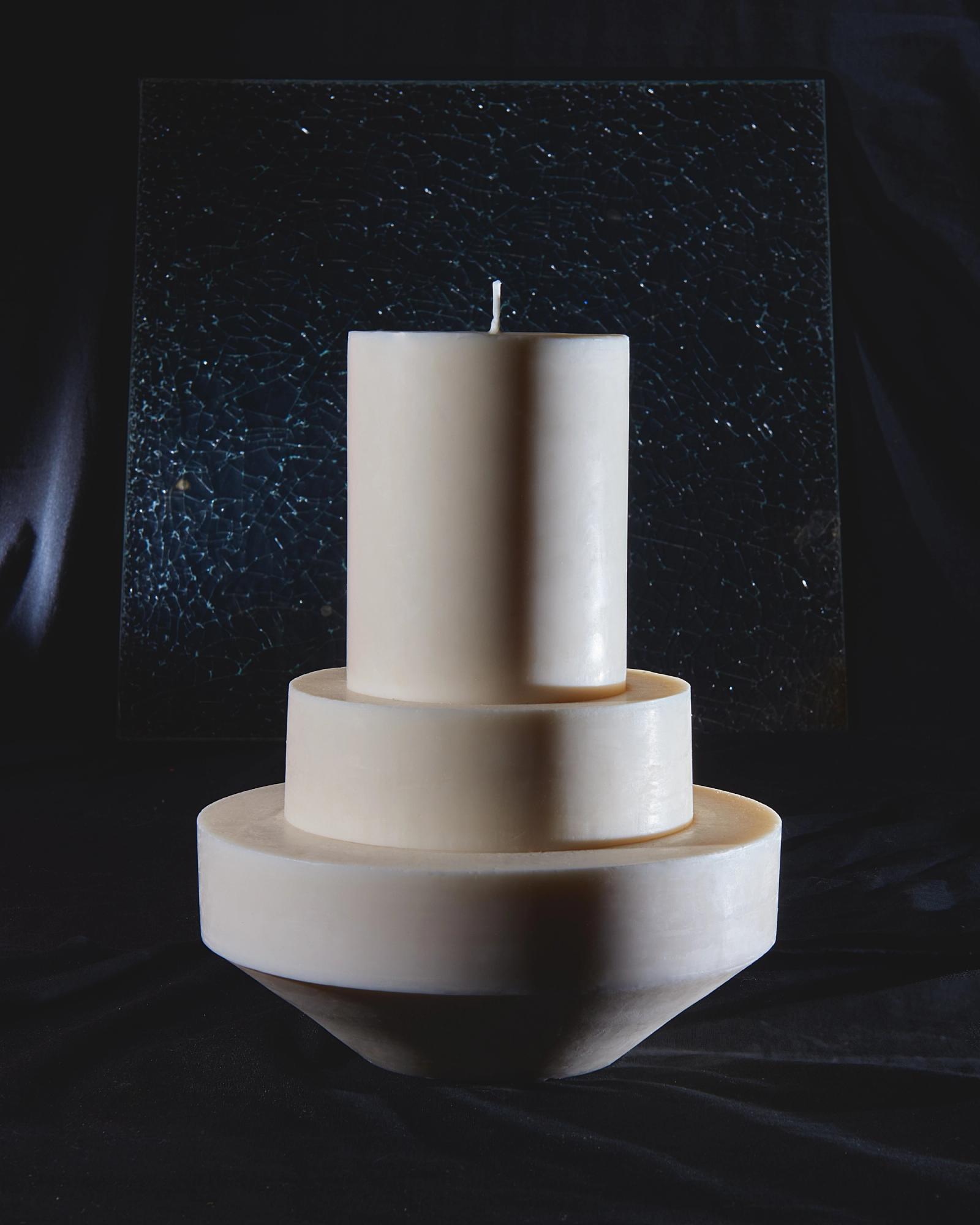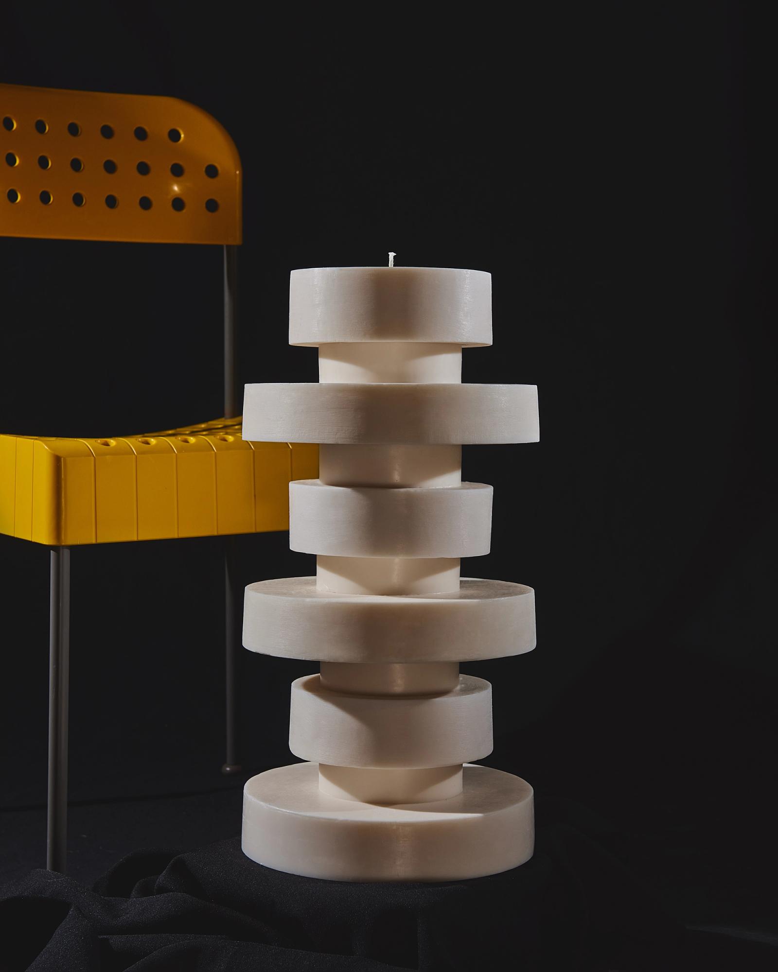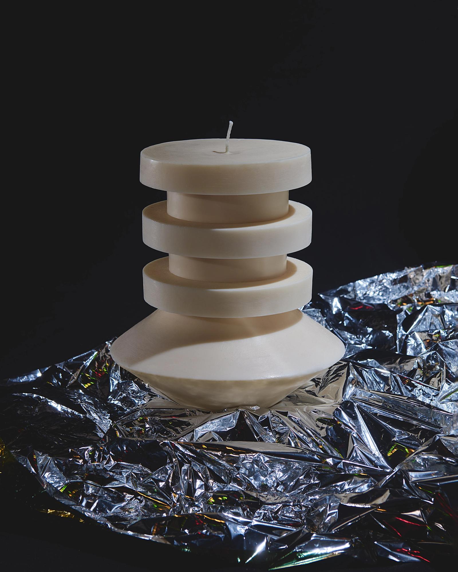 In her atelier, she has created a unique and almost ritual process to orchestrate the forms of her totemic candles. Each geometric element is molded separately before coming together into one sculpture. At the center, a thick candle wick acts as a backbone for the structure whilst four other hidden wicks extend the skeleton of the Very Big candle. These four secondary wicks will only come to light when the candle has already burned for a few hours, renewing the fascination with other forms and shadows.