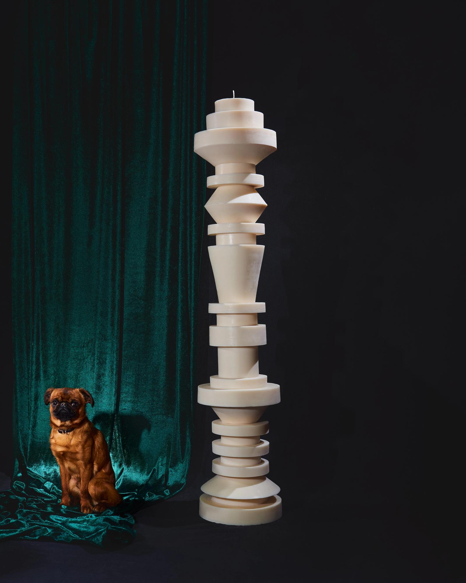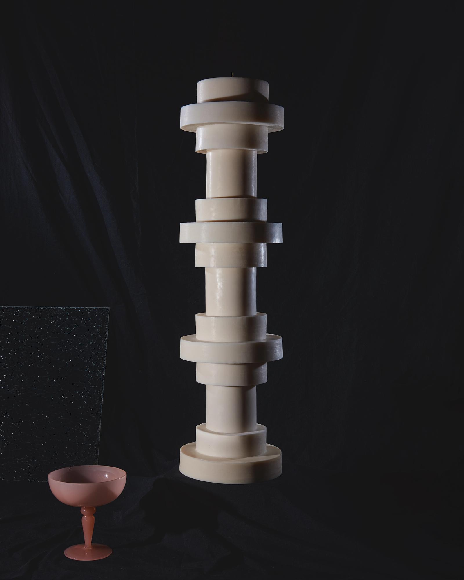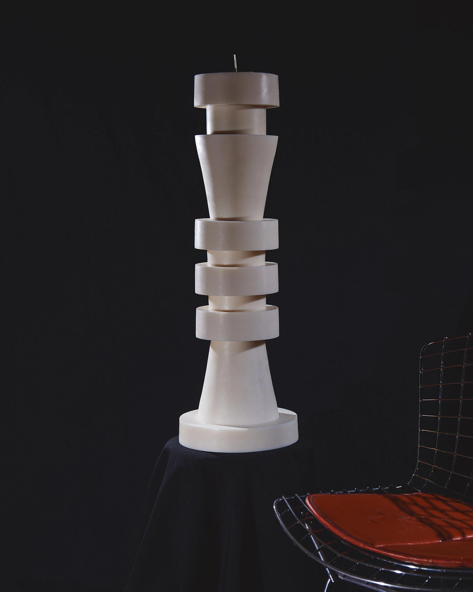In her atelier, she has created a unique and almost ritual process to orchestrate the forms of her totemic candles. Each geometric element is molded separately before coming together into one sculpture. At the center, a thick candle wick acts as a backbone for the structure whilst four other hidden wicks extend the skeleton of the Very Big candle. These four secondary wicks will only come to light when the candle has already burned for a few hours, renewing the fascination with other forms and shadows.