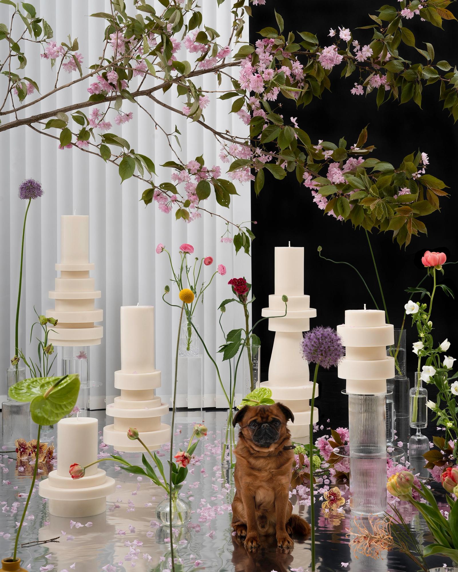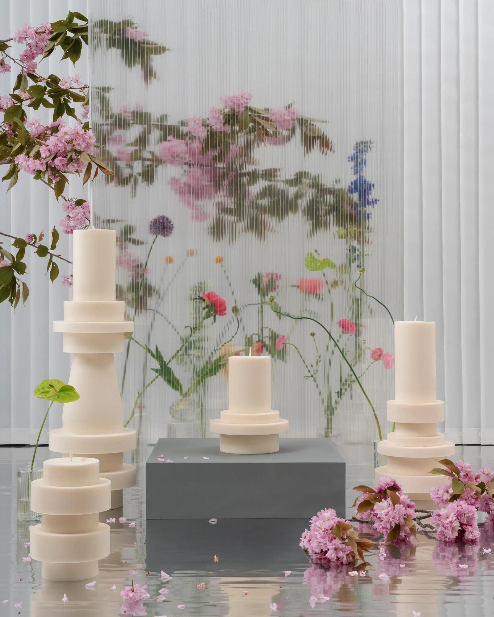In her atelier, she has created a unique and almost ritual process to orchestrate the forms of her totemic candles. Each geometric element is molded separately before coming together into one sculpture. At the center, a thick candle wick acts as a backbone for the structure whilst four other hidden wicks extend the skeleton of the Very Big candle. These four secondary wicks will only come to light when the candle has already burned for a few hours, renewing the fascination with other forms and shadows.